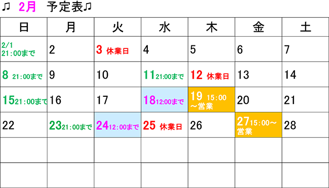 2026.01.29 2月の日程表(青葉区二日町仙台メディカル整骨院)