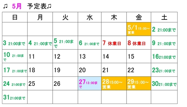 2026.04.26 五月の日程表です。(青葉区二日町仙台メディカル整骨院)